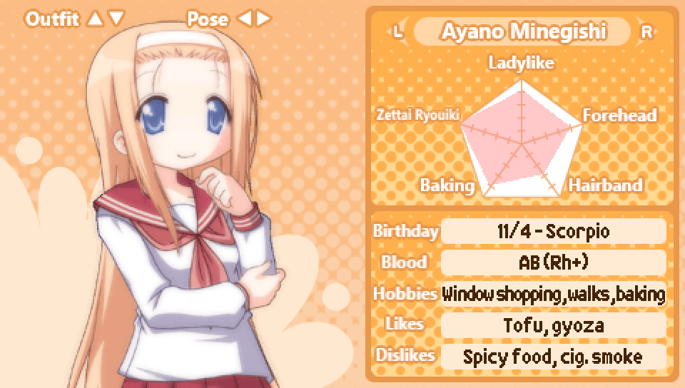 Ayano is the only Lucky Star girl that wears thigh socks, and therefore is the only one with a "zettai ryouiki",