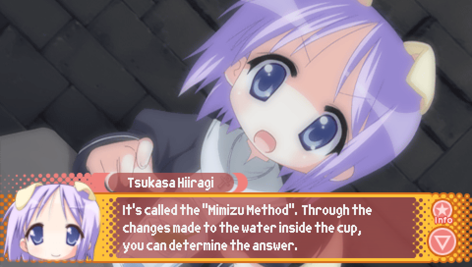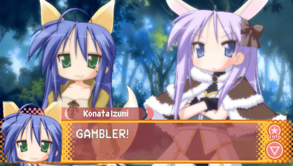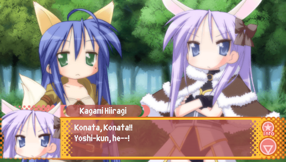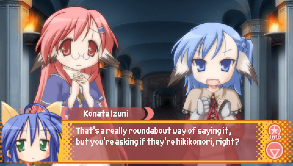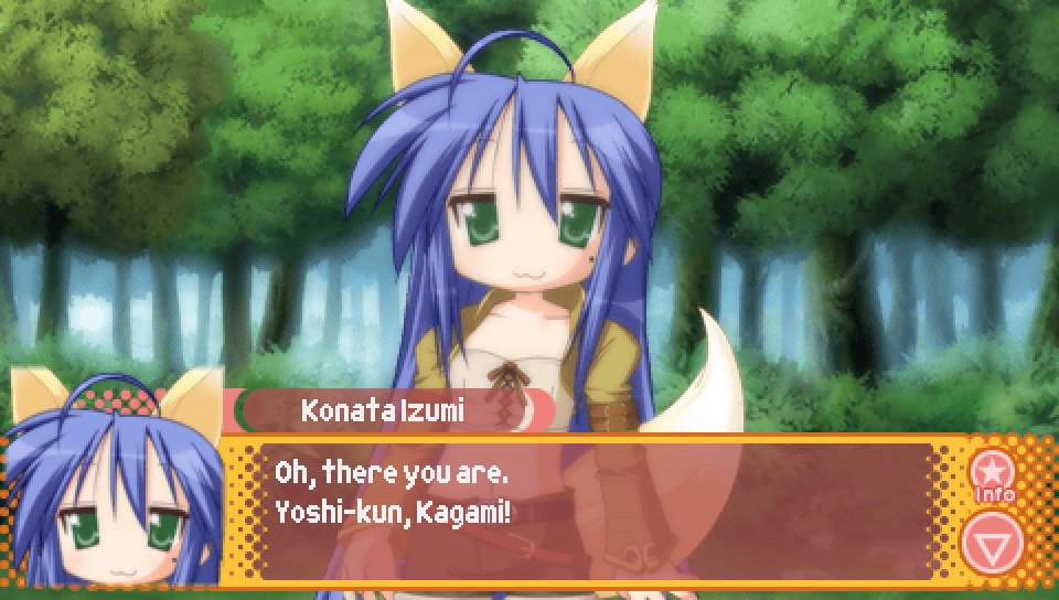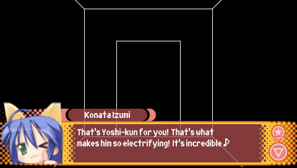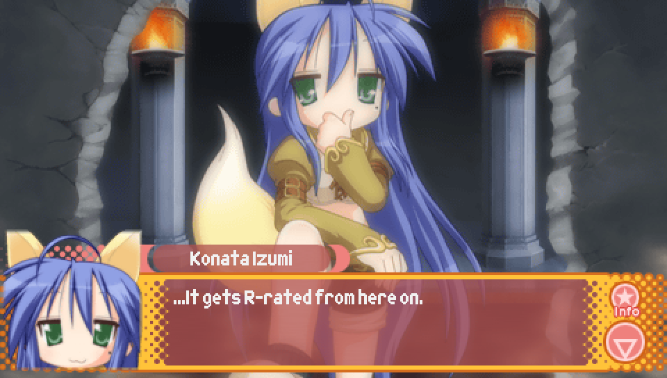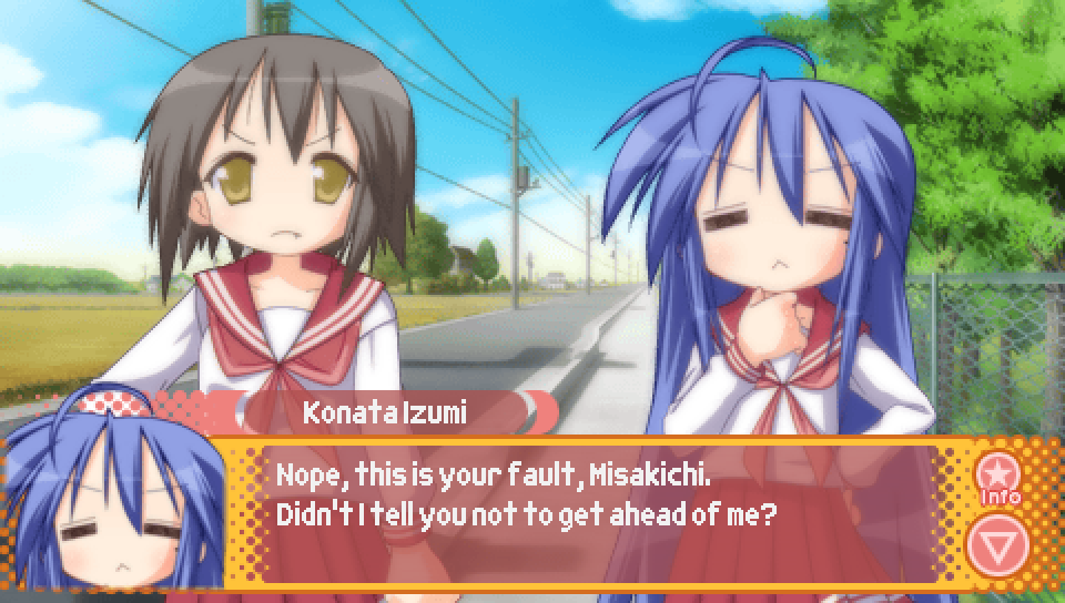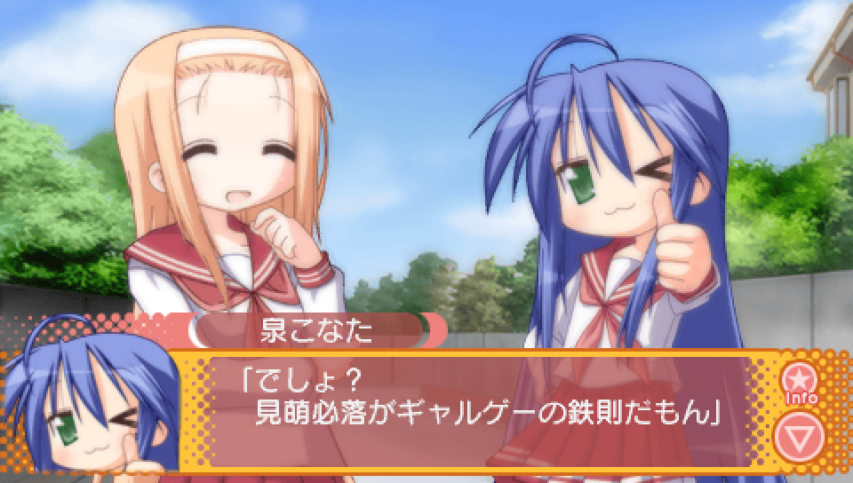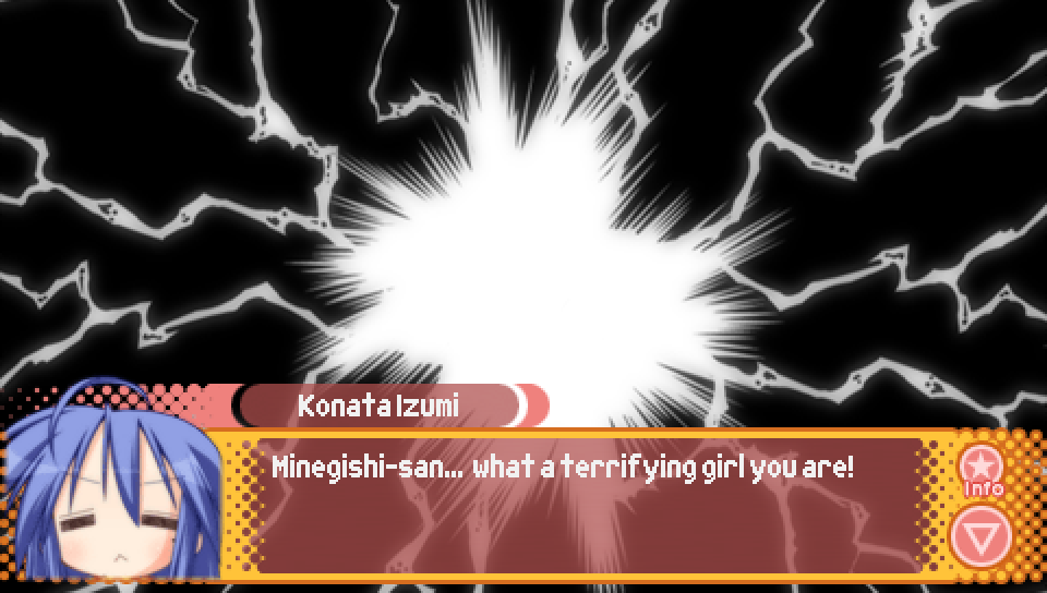 This line from Konata in the intro, where she talks about a game where you can