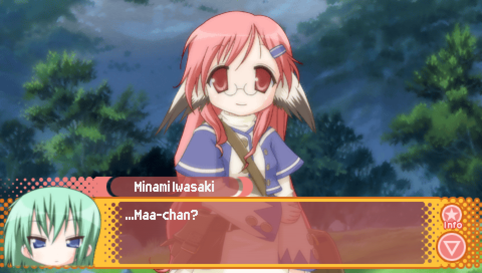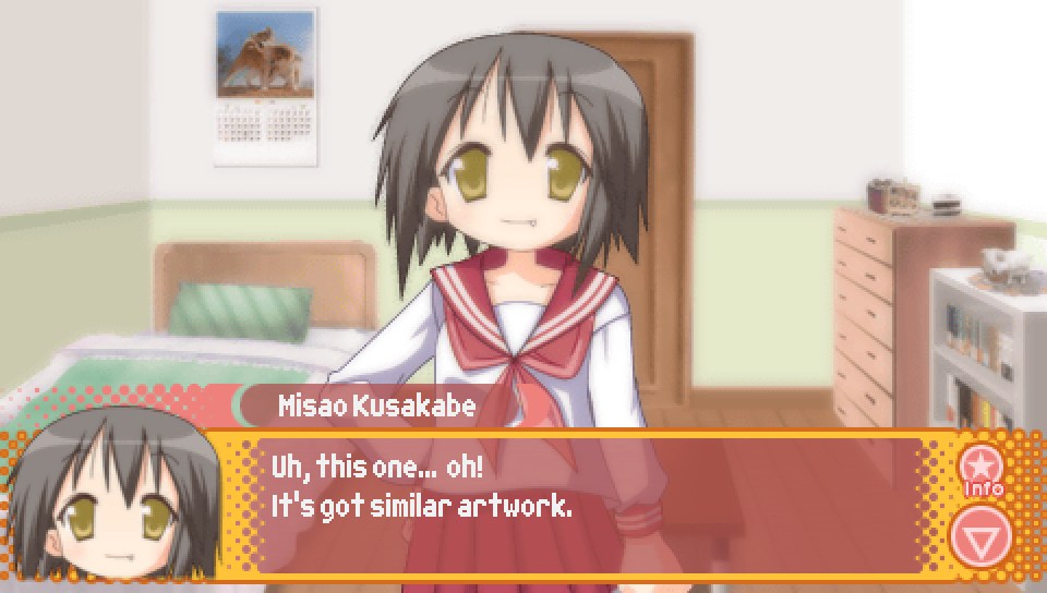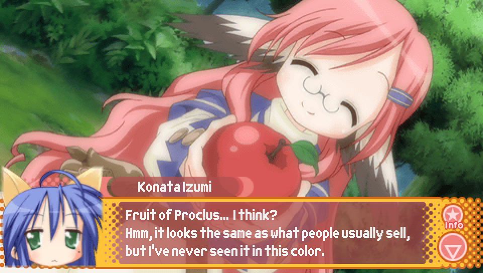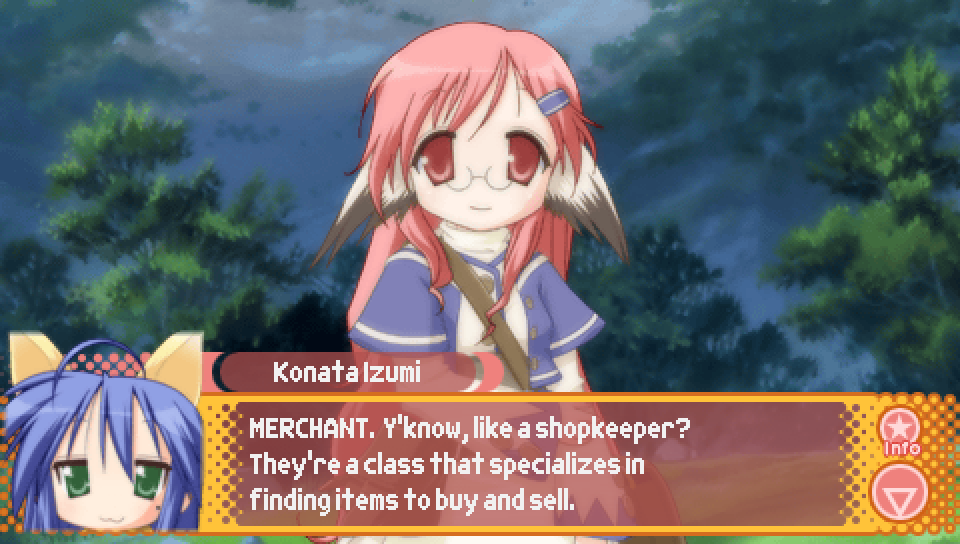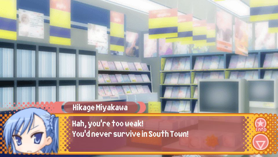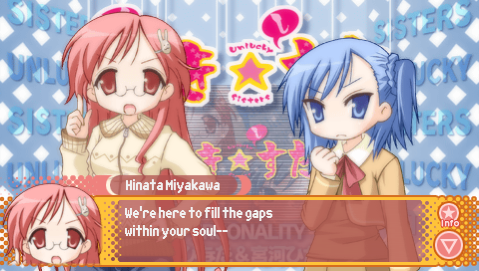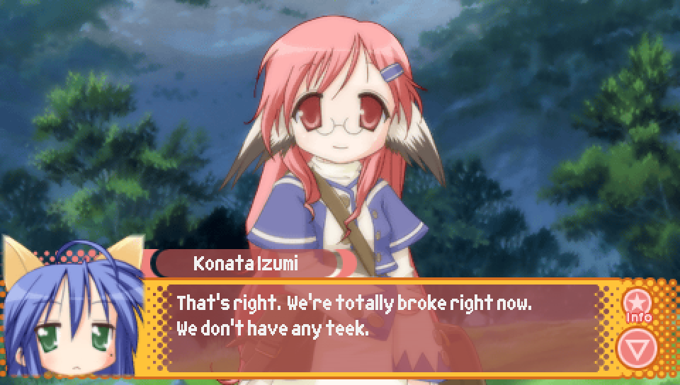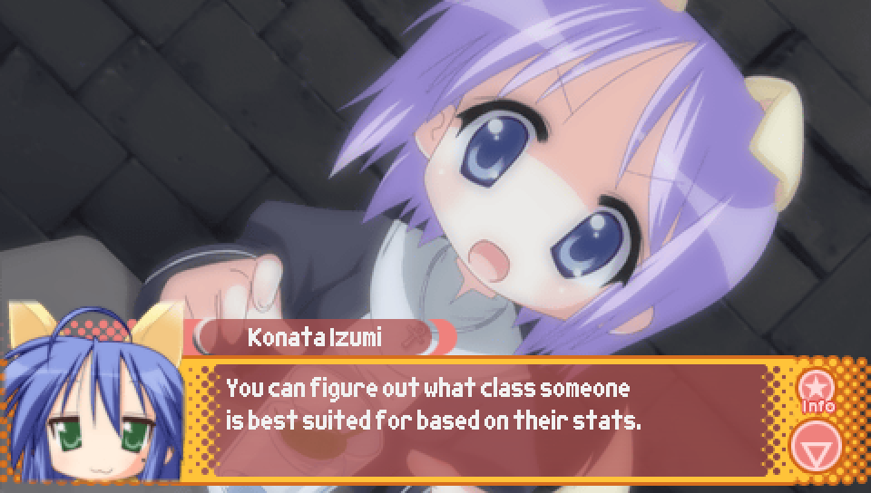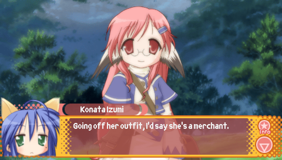 This line from Konata in the intro, where she talks about a game where you can