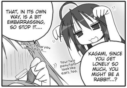 Of course, Tsukasa is actually holding neither. Instead, Konata is just making reference