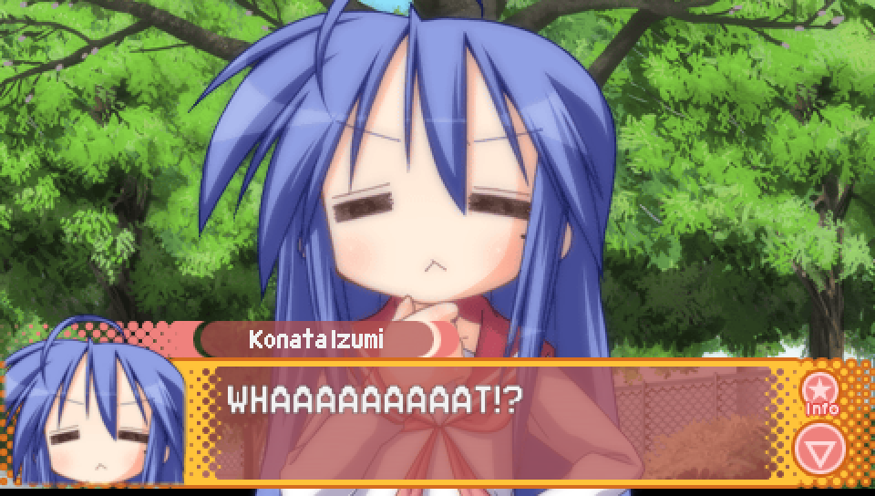 that he intends to confess his love to Ayano, Konata shouts in surprise "WHAAAAAAAAAT!?" ("nanto!" in Japanese).