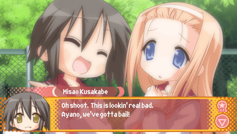 - Ayano Lucky Lucky Memorial Route -- Run into Ayano and Misao on the way to school on the first day.
