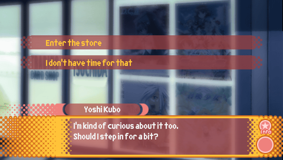 Note that by seeing this choice, you unlock the ability to go to the Trading Card Shop in Episode 1.